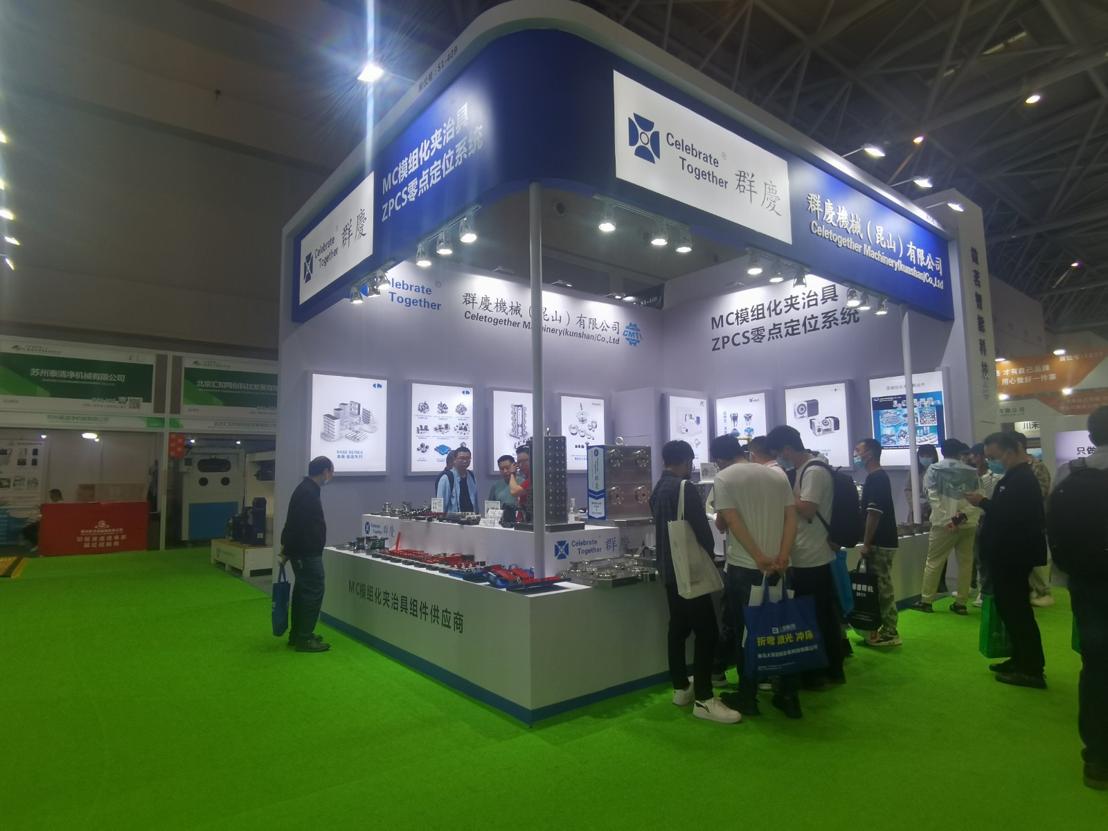 群慶機械受邀參加,也為前來的新老客戶展示了MC模塊化工裝夾治具、MC基板基座、多工位并列式虎鉗、零點定位系統(tǒng),自定心虎鉗,歐權(quán)第四/五軸等配套加工精密夾具等,群慶機械專業(yè)的銷售工程師團隊也給客戶提供了專業(yè)的產(chǎn)品方案建議以及實際案列分享。